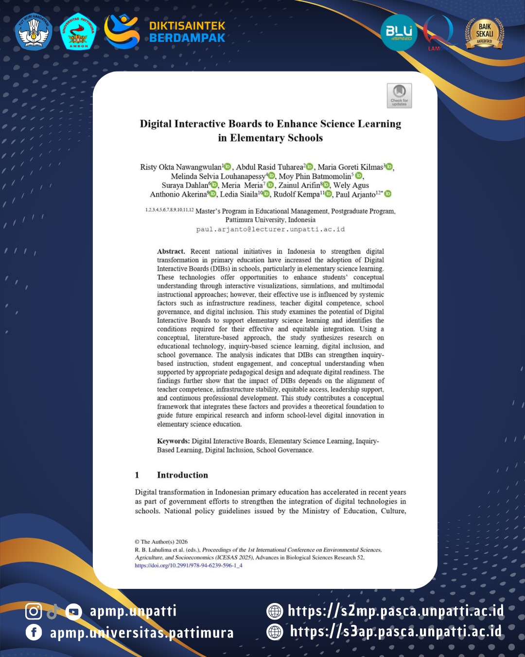 The Masterβs Program in Educational Management, Postgraduate Program of Pattimura University proudly presents recent international publications highlighting impactful research in education: