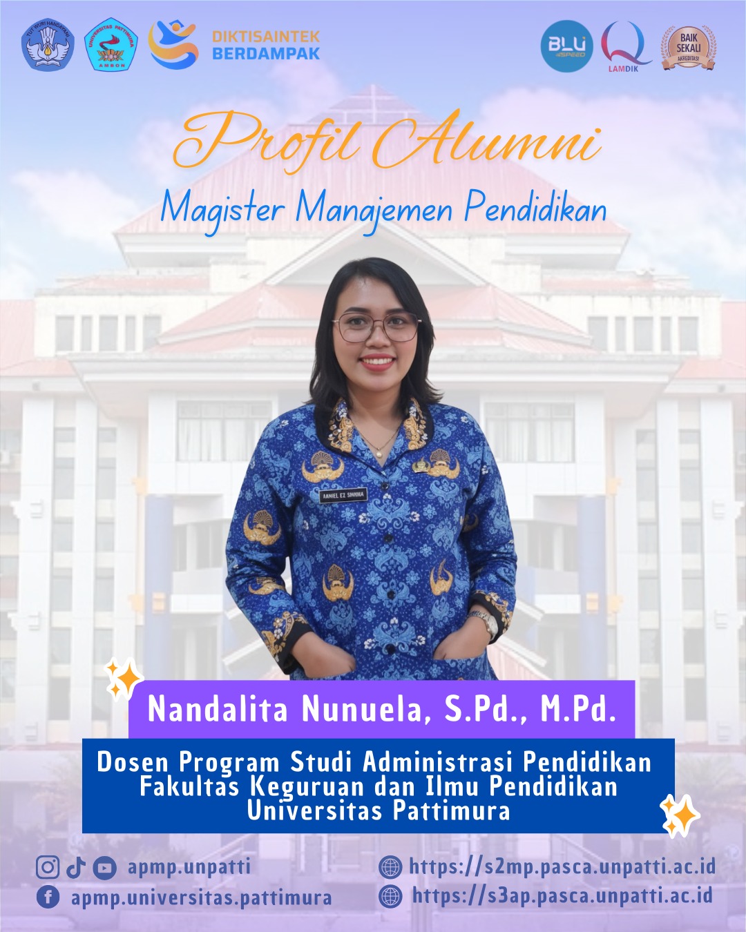 Proud to introduce Nandalita Nunuela, S.Pd., M.Pd. — a Master’s alumnus of Educational Management who currently serves as a Lecturer in the Educational Administration Study Program, Faculty of Teacher Training and Education, Pattimura University.