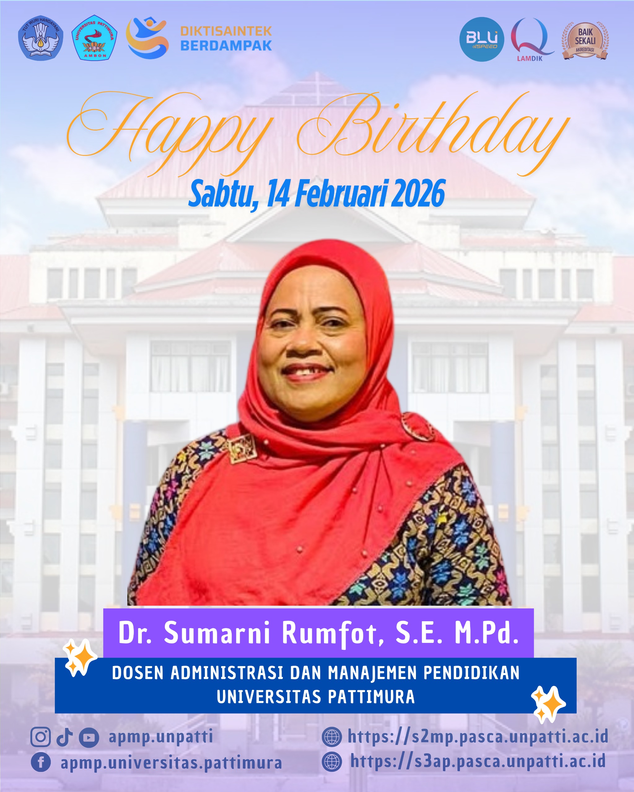 Happy Birthday, Dr. Sumarni Rumfot, S.E., M.Pd. 🎉May you be blessed with good health, happiness, and continued success in your dedication to education. Thank you for being an inspiring leader and role model. Wishing you a year filled with joy and meaningful achievements. ✨